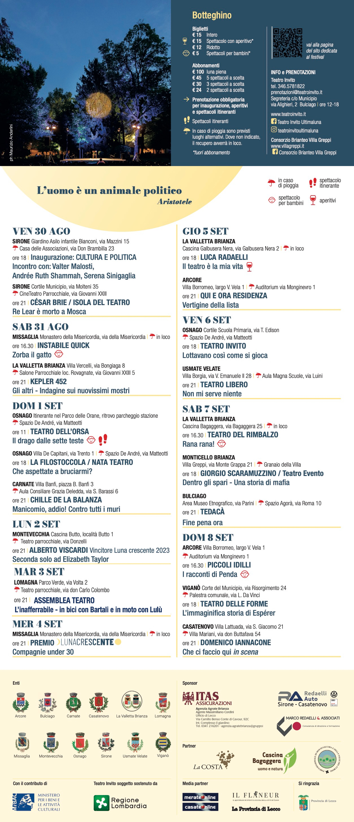 Il comune di La Valletta Brianza ha aderito all'iniziativa, promossa ed organizzata dal Consorzio Brianteo Villa Greppi di Monticello Brianza, denominata "L'Ultima Luna d'Estate 2024" un festival teatrale nelle ville e nei parchi più belli della Brianza.